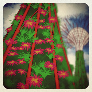 Normally, this kind of thing wouldn’t really catch my eye except that they have built 18 solar-powered supertrees in the Bay South Garden. The man-made trees are each between 25 and 50 meters talll, and are made of a steel framework. The trunks of the trees are made of concrete, and the steel canopies themselves weigh up to 88 tons. Each tree has ferns and tropical flowers growing along its frame. The trees will develop into green canopies of shade which will absorb and disperse heat for pedestrians in the park.