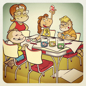 Easter was always a special event when my kids were little. First of all we would spend all day dying the hardboiled eggs and decorating them. I well remember that chrome kitchen table covered with newspapers and kids sitting on their knees in the chair carefully drawing on their eggs and then choosing the colours they wanted their egg to be. I would make up pint mason jars with all different colours by putting about a cup of lukewarm water in each, 2 tablespoons of vinegar, and about a teaspoon of food colouring.
